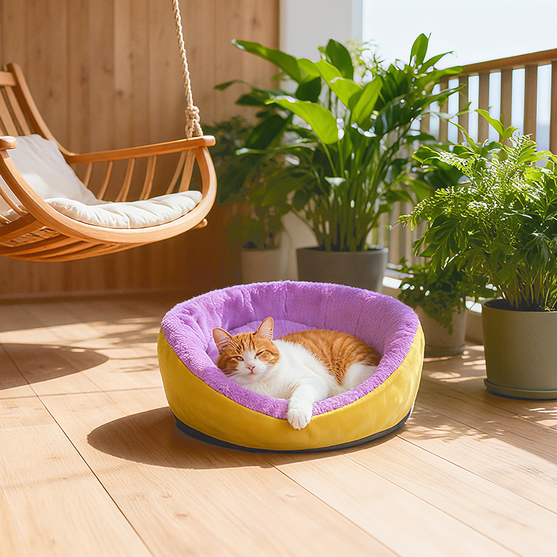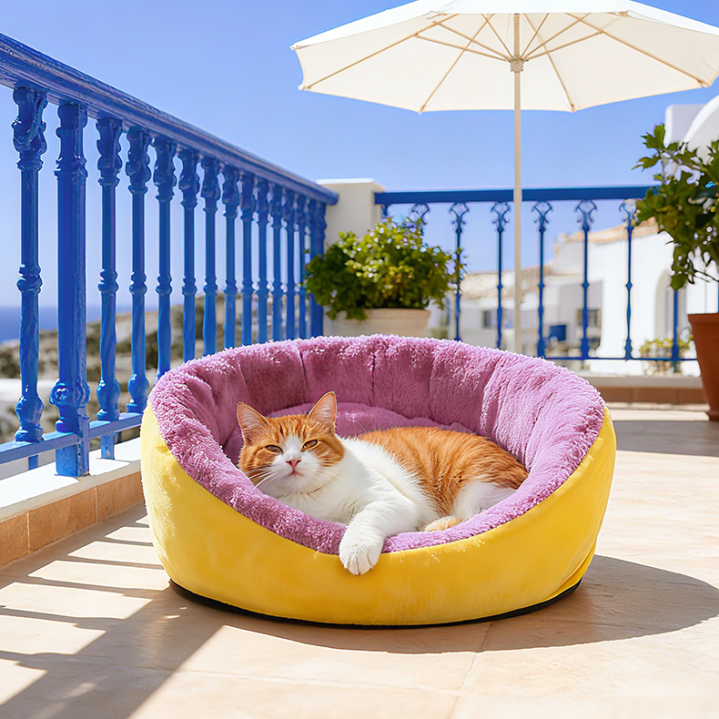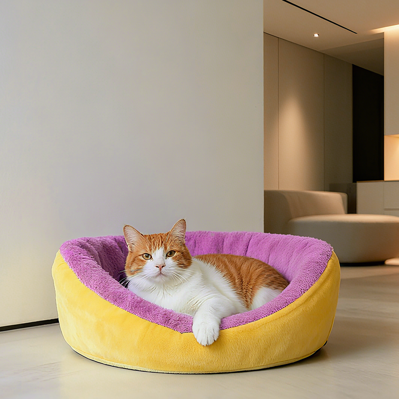 《Fashionable Color-Contrast Pet Sofa》: The creative combination of bright yellow and pink tones breaks the traditional monotony with high-recognizability color schemes, making it the eye-catching focus of the home. It adds a trendy touch when taking photos with your pet. The fine velvet material paired with a high-elastic core offers a touch as soft and fluffy as a cloud, enveloping your pet's body and instantly relieving stress upon lying down. The circular high backrest fits the curve of the head and neck, providing support, while the inner padding evenly distributes pressure, safeguarding the health of the spine, making it suitable for long periods of rest. The round shape is compatible with various home styles such as modern and Nordic, serving both as a cozy pet bed and a decorative item to enhance the space's aesthetic, achieving a harmonious blend of human and pet aesthetics. The stain-resistant fabric resists daily dirt and stains, allowing for quick cleaning of local dirt, and the overall durability reduces the need for frequent washing, making pet care more worry-free. It is a choice that combines appearance and practicality in a pet sofa!